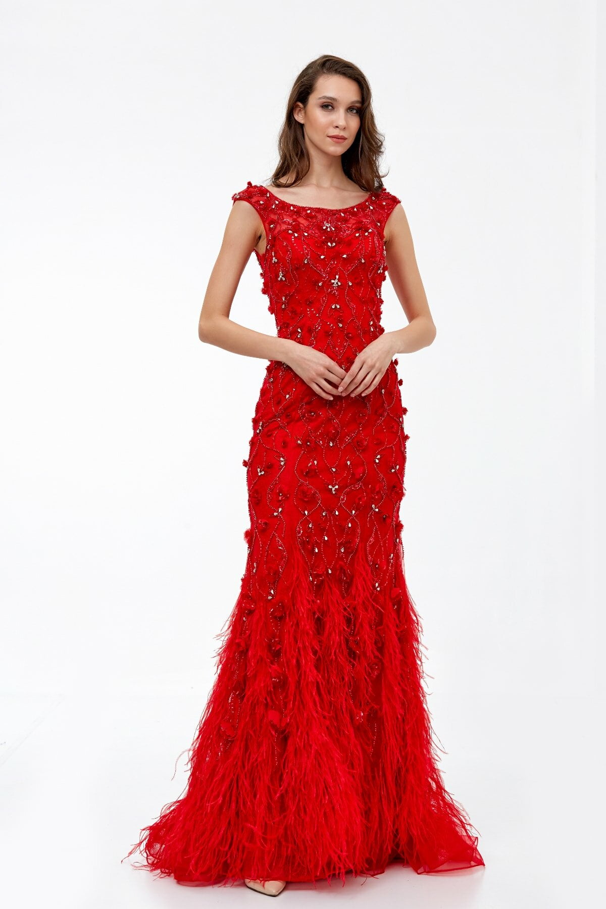 Kırmızı Tüylü İşlemeli Abiye